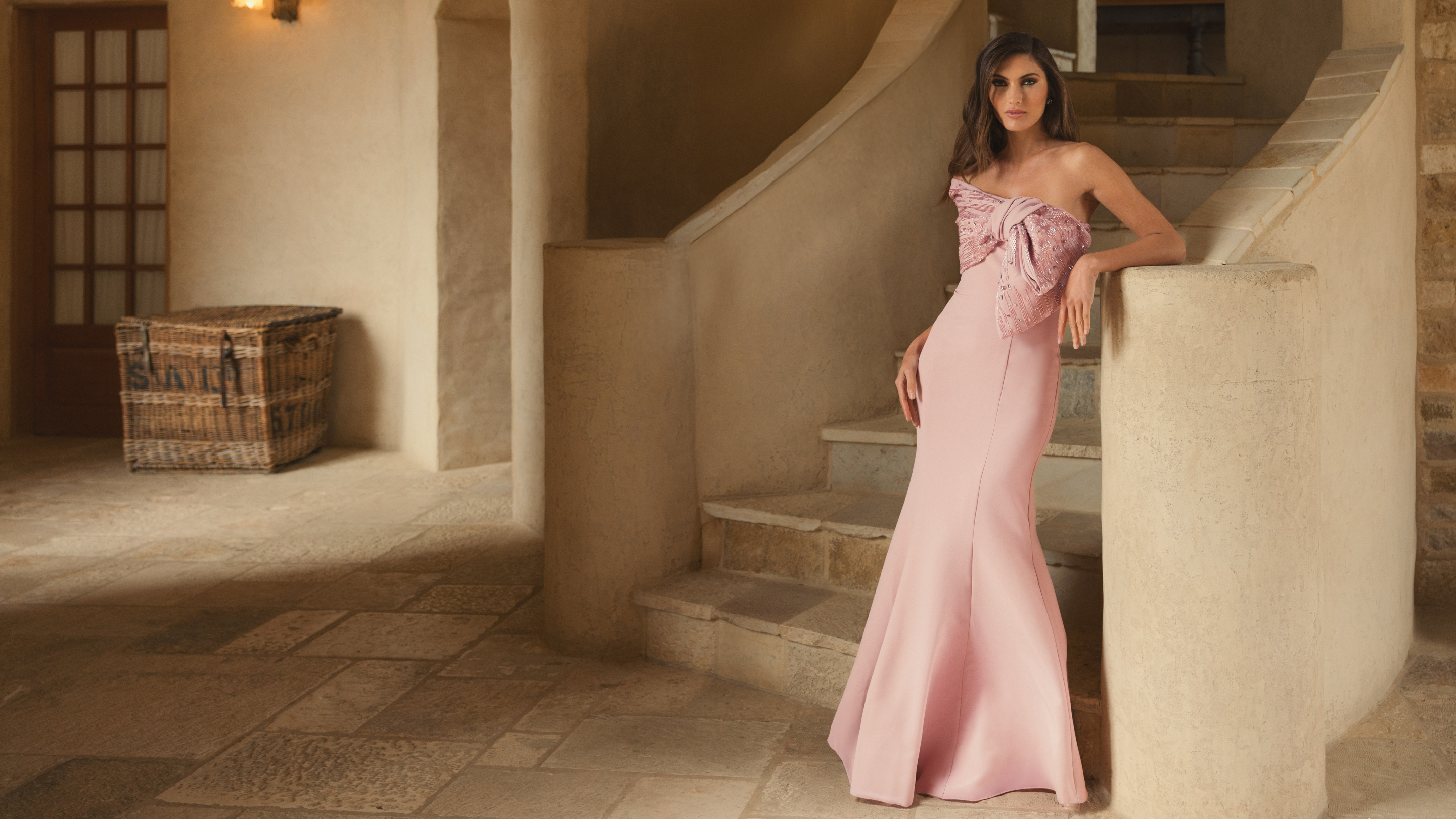 Brocade Strapless Floral Gown With Bow Detail - Champagne