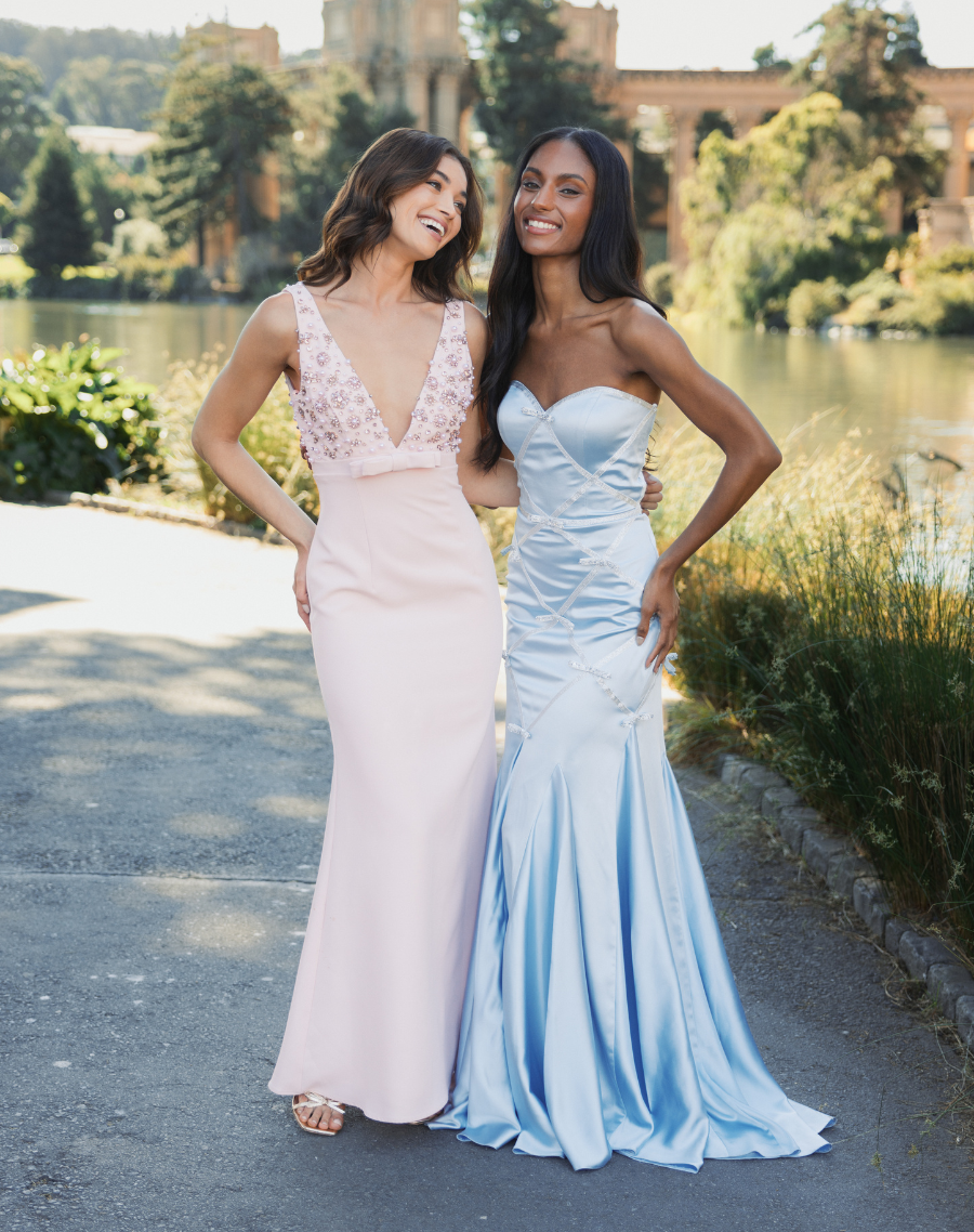 Long Sleeve Satin Structured Bow Draped Column Gown - Blue