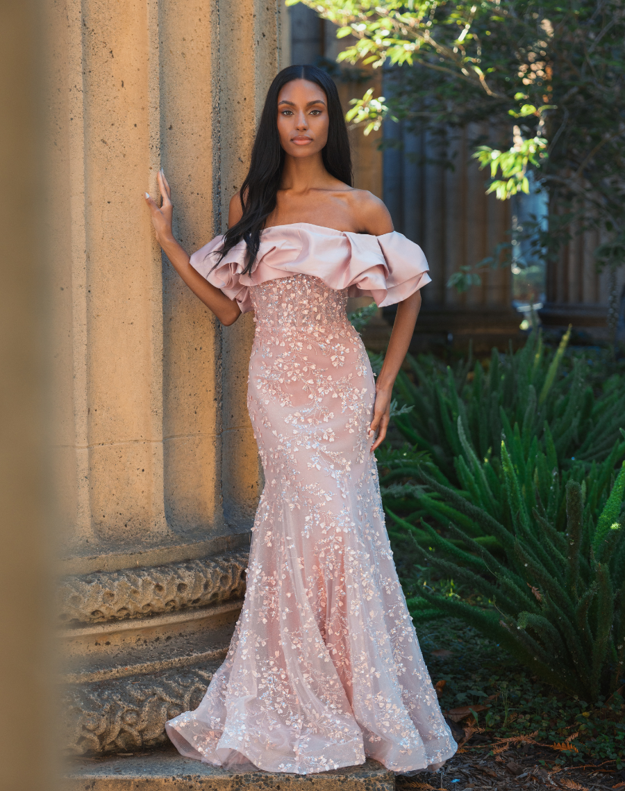Beaded Applique Off The Shoulder Mermaid Gown - Rose